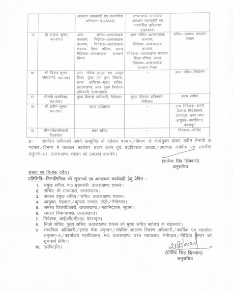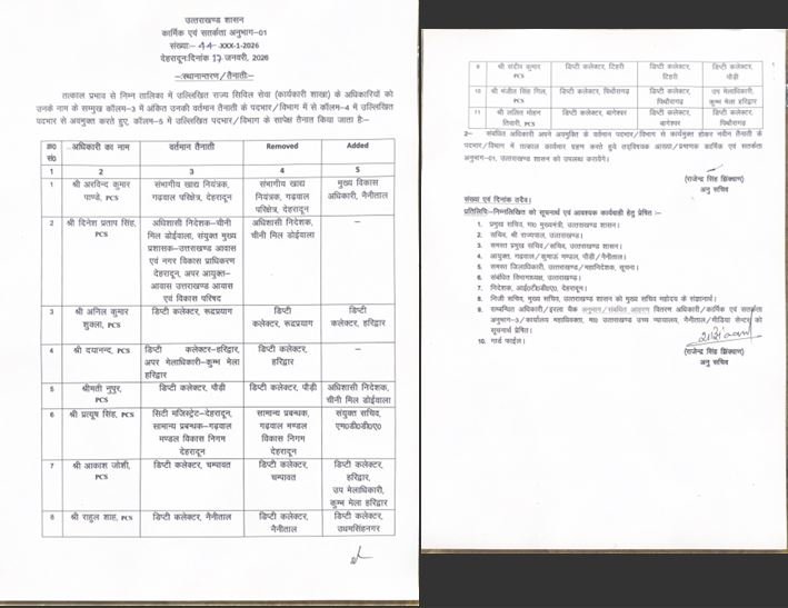 दिनेश प्रताप सिंह को अधिशासी निदेशक, चीनी मिल डोईवाला की जिम्मेदारी दी गई है। अनिल कुमार शुक्ला को डिप्टी कलेक्टर हरिद्वार भेजा गया है।