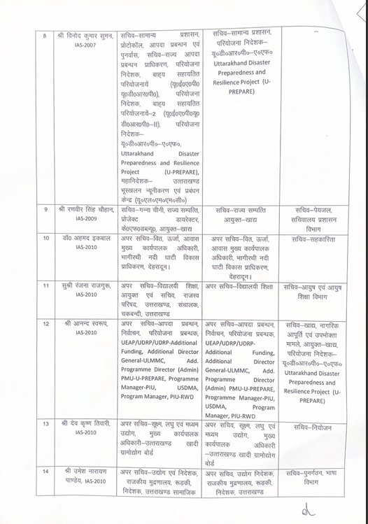 IAS संवर्ग में प्रमुख स्तर पर बदलाव किए गए हैं। वर्ष 2001 बैच के अधिकारी आर. मीनाक्षी सुन्दरम से प्रमुख सचिव ऊर्जा, नियोजन सहित अन्य अतिरिक्त प्रभार हटाते हुए उन्हें प्रमुख सचिव आवास, आयुक्त आवास एवं मुख्य प्रशासक उत्तराखण्ड आवास एवं नगर विकास प्राधिकरण की जिम्मेदारी दी गई है।