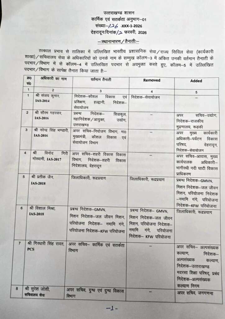 देहरादून। उत्तराखंड शासन के कार्मिक एवं सतर्कता अनुभाग-01 द्वारा जारी आदेश संख्या 126-XXX-1-2026 (दिनांक 2 फरवरी 2026) के तहत प्रदेश में व्यापक प्रशासनिक फेरबदल किया गया है। भारतीय प्रशासनिक सेवा, राज्य सिविल सेवा (कार्यकारी शाखा) तथा सचिवालय सेवा के कई अधिकारियों को तत्काल प्रभाव से नई तैनाती दी गई है।