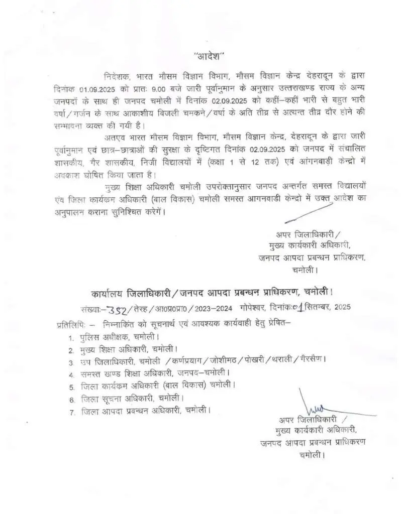 मौसम विज्ञान केंद्र, देहरादून के अनुसार जनपद चमोली में भी भारी से बहुत भारी वर्षा का पूर्वानुमान है। इसके मद्देनजर चमोली जनपद में 2 सितम्बर अर्थात मंगलवार को सभी आंगनबाड़ी केंद्रों के साथ कक्षा 1 से 12वीं तक के विद्यालयों में अवकाश घोषित किया गया है।