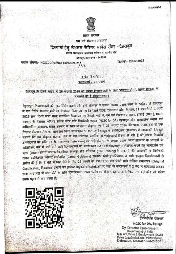 रोजगार समाचार: देहरादून में 26 फरवरी को दिव्यांगजनों के लिए लगेगा विशेष रोजगार मेला