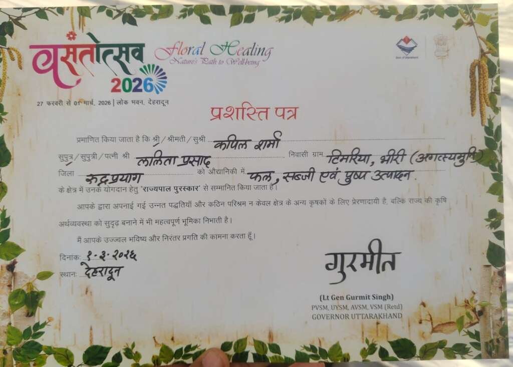 अगस्त्यमुनि। देहरादून स्थित लोक भवन में आयोजित ‘वसंतोत्सव 2026 – फ्लोरल हीलिंग: नेचर्स पाथ टू वेलबीइंग’ कार्यक्रम के दौरान रुद्रप्रयाग जिले के ग्राम टिमरिया, (अगस्त्यमुनि) निवासी प्रगतिशील कृषक कपिल शर्मा को फल, सब्जी एवं पुष्प उत्पादन के क्षेत्र में उल्लेखनीय कार्य के लिए राज्यपाल पुरस्कार से सम्मानित किया गया। उन्हें राज्यपाल लेफ्टिनेंट जनरल गुरमीत सिंह (सेवानिवृत्त) द्वारा प्रशस्ति पत्र प्रदान किया गया।
