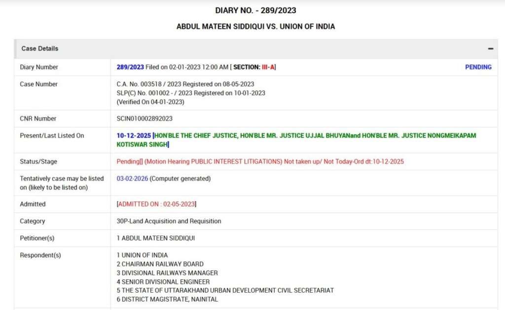 Haldwani Big News-उत्तराखंड के नैनीताल जनपद अंतर्गत हल्द्वानी के बहुचर्चित बनभूलपुरा रेलवे भूमि अतिक्रमण मामले में अब सुप्रीम कोर्ट में अगली सुनवाई की तिथि बढ़ा दी गई है, इससे पहले इस प्रकरण में 10 दिसंबर को प्रस्तावित सुनवाई नहीं हो सकी थी, जिसके बाद न्यायालय द्वारा 16 दिसंबर की तिथि निर्धारित की गई थी। हालांकि अब ताज़ा जानकारी के अनुसार, अगली सुनवाई की तारीख बदलकर 3 फरवरी तय कर दी गई है।