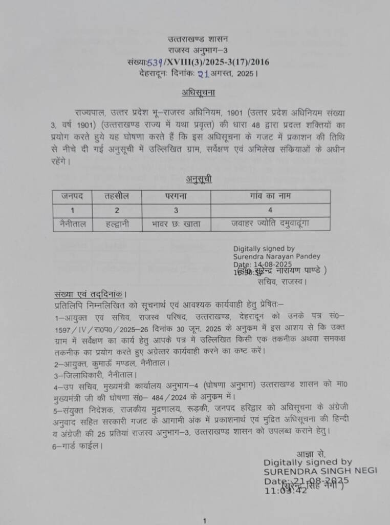 हल्द्वानी। आज 21 अगस्त को उत्तराखंड शासन राजस्व अनुभाग 3 के पत्रांक संख्या 539/xviii/3/2025/2016 देहरादून द्वारा दमुआढूँगा में धारा 48 की अधिसूचना जारी हो गई है। इस आदेश के बाद दमुवाढूँगा क्षेत्र के निवासियों के लिए आज का दिन ऐतिहासिक बन गया है।