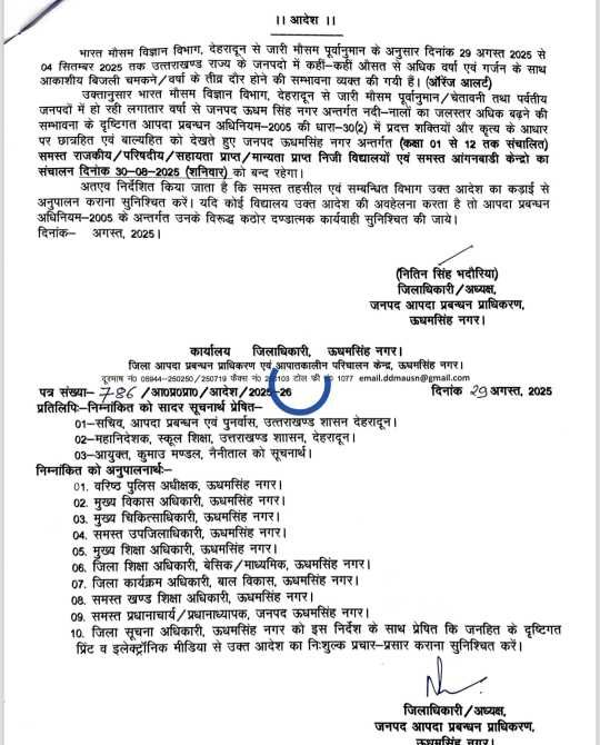 उक्तानुसार भारत मौसम विज्ञान विभाग, देहरादून से जारी मौसम पूर्वानुमान / चेतावनी तथा पर्वतीय जनपदों में हो रही लगातार वर्षा से जनपद ऊधम सिंह नगर अन्तर्गत नदी-नालों का जलस्तर अधिक बढ़ने की सम्भावना के दृष्टिगत आपदा प्रबन्धन अधिनियम-2005 की धारा-30 (2) में प्रदत्त शक्तियों और कृत्य के आधार पर छात्रहित एवं बाल्यहित को देखते हुए जनपद ऊधमसिंह नगर अन्तर्गत (कक्षा 01 से 12 तक संचालित) समस्त राजकीय/परिषदीय/ सहायता प्राप्त/मान्यता प्राप्त निजी विद्यालयों एवं समस्त आंगनबाडी केन्द्रो का संचालन दिनांक 30-08-2025 (शनिवार) को बन्द रहेगा।