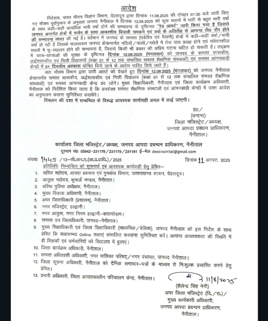 दिनांक 12.08.2025 (मंगलवार) को नैनीताल जनपद के समस्त शासकीय, अर्द्धशासकीय एवं निजी विद्यालय (कक्षा 1 से 12 तक संचालित संस्थाए) एवं समस्त आंगनबाड़ी केन्द्रों में 01 दिवसीय अवकाश घोषित।