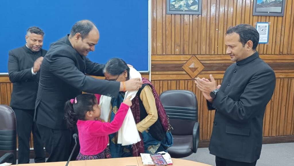 सभागार में आयोजित औपचारिक कार्यक्रम में जिलाधिकारी मनीष कुमार ने स्वतंत्रता संग्राम सेनानियों के परिजनों को यूकेजी में पढ़ने वाली साढ़े चार वर्ष की नन्ही बालिका भार्गवी वर्मा, जो जनपद के उज्ज्वल भविष्य की प्रतीक हैं, और 59 वर्षीय अर्दली चंदन सिंह रावत, जिन्होंने अपने 32 वर्षों की सेवा में 5 पिथौरागढ़ तथा 24 चंपावत के कुल 29 जिलाधिकारियों के साथ कार्य कर जनपद के एक मजबूत स्तंभ के रूप में पहचान बनाई है, के हाथों शॉल ओढ़ाकर सम्मानित किया।