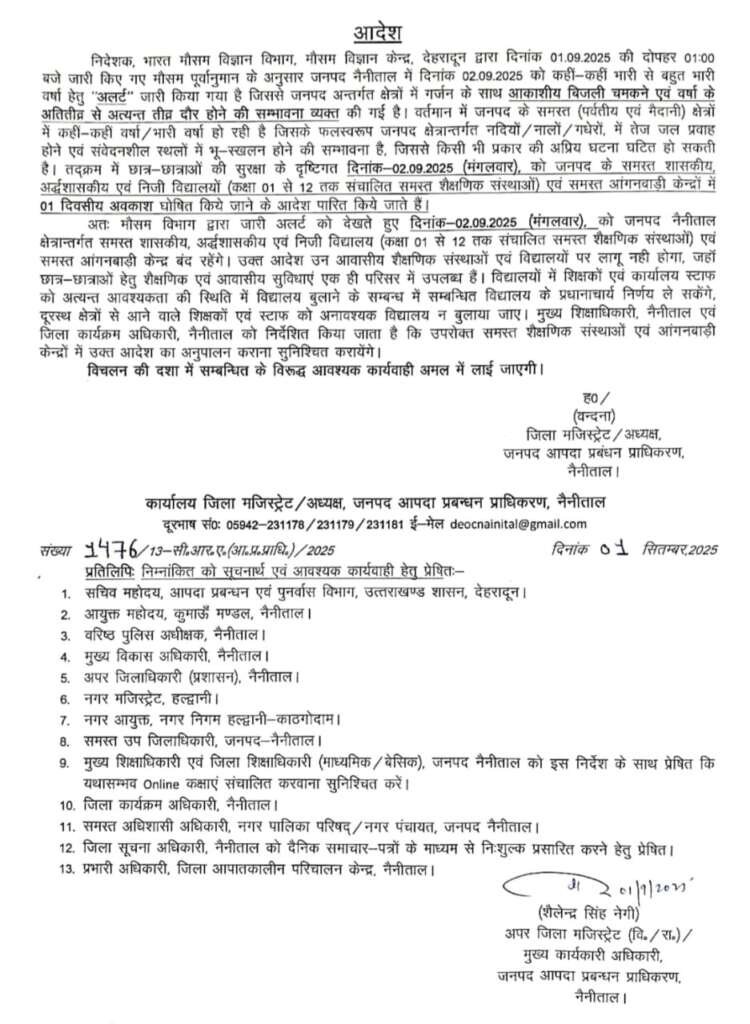 मौसम विभाग द्वारा जारी चेतावनी व मौसम पूर्वांनुमान के सम्बन्ध में जानकारी देते हुए जिलाधिकारी व अध्यक्ष जिला आपदा प्रबंधन प्राधिकरण नैनीताल वंदना ने अवगत कराया कि संभावित आपदा जोखिमों जैसे भूस्खलन, सड़क अवरोध, जलभराव, अंधड़ एवं नदी-नालों में तेज बहाव को ध्यान में रखते हुए विद्यार्थियों की सुरक्षा हेतु जनपद नैनीताल में संचालित सभी शासकीय, अशासकीय एवं निजी विद्यालय (कक्षा 1 से 12 तक) एवं समस्त आंगनबाड़ी केंद्रों में दिनांक 2 सितम्बर 2025 (मंगलवार) को एक दिवसीय अवकाश रहेगा।