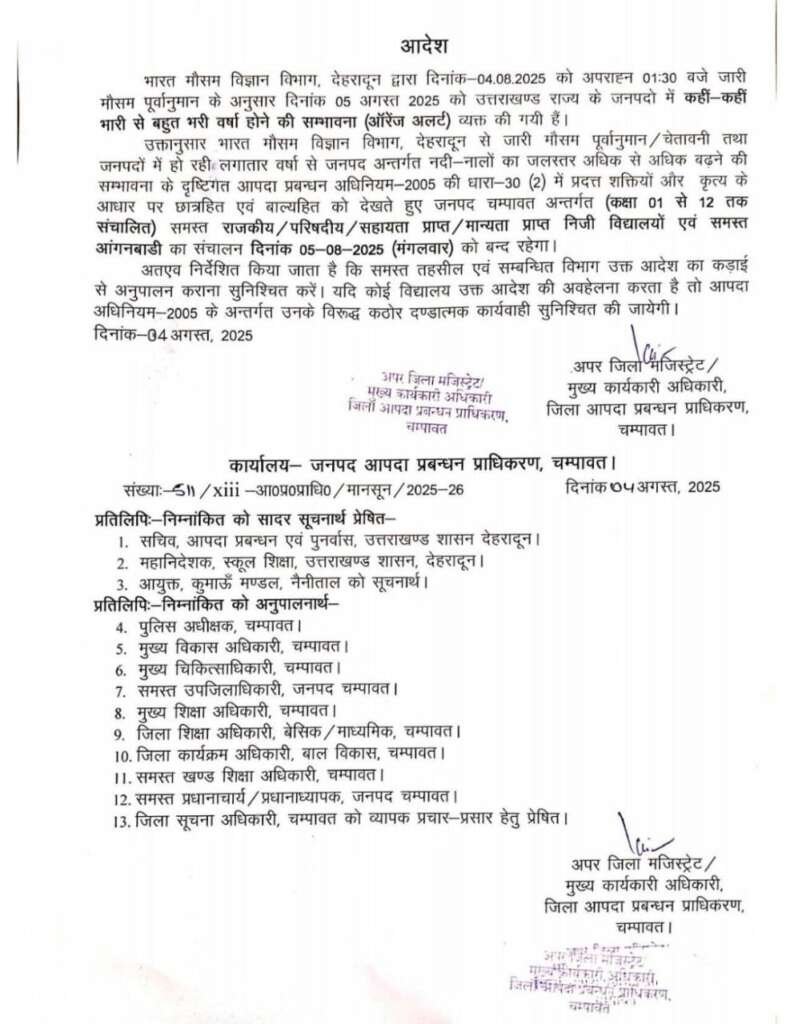 Champawat News- उत्तराखंड में भारी बारिश और मौसम विभाग द्वारा जारी चेतावनी के दृष्टिगत जिला प्रशासन चंपावत ने विद्यार्थियों की सुरक्षा को प्राथमिकता देते हुए दिनांक 05 अगस्त 2025 (मंगलवार) को जिले के सभी शासकीय, अर्द्धशासकीय एवं निजी विद्यालय (कक्षा 1 से 12 तक संचालित समस्त शैक्षणिक संस्थान) तथा सभी आंगनबाड़ी केन्द्रों में एक दिवसीय अवकाश घोषित किया है।