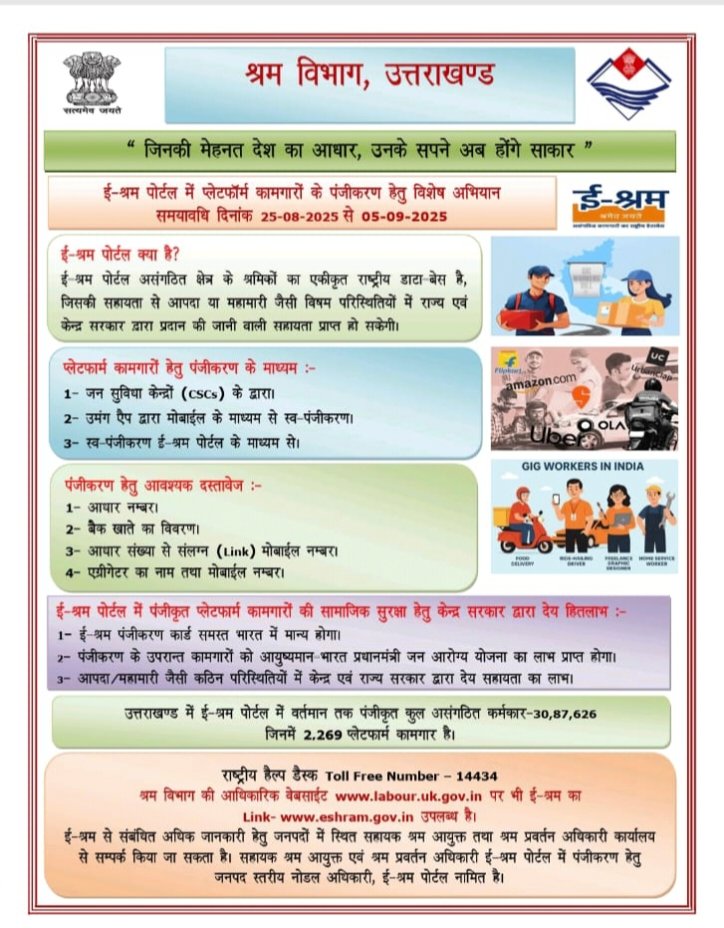 Champawat (Uttarakhand): श्रम विभाग द्वारा 25 अगस्त से 5 सितंबर 2025 तक प्लेटफार्म कामगारों के लिए ई-श्रम पोर्टल पर पंजीकरण का विशेष अभियान चलाया जा रहा है।