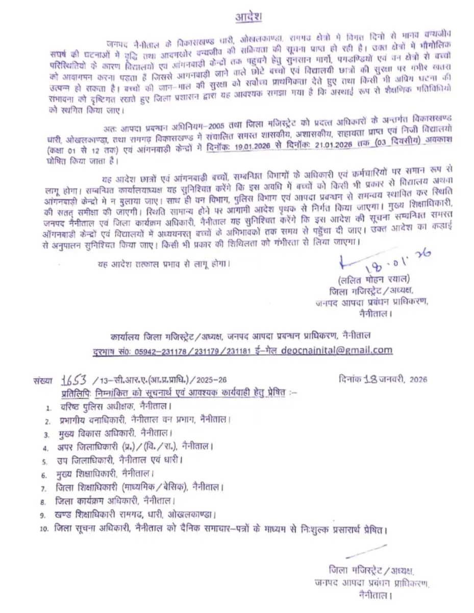 अतः आपदा प्रबंधन अधिनियम, 2005 तथा जिला मजिस्ट्रेट को प्रदत्त अधिकारों के अंतर्गत विकासखण्ड धारी, ओखलकाण्डा एवं रामगढ़ में संचालित समस्त शासकीय, अशासकीय, सहायता प्राप्त एवं निजी विद्यालयों (कक्षा 01 से 12 तक) तथा आंगनवाड़ी केन्द्रों में दिनांक 19.01.2026 से 21.01.2026 तक (03 दिवस) अवकाश घोषित किया जाता है।