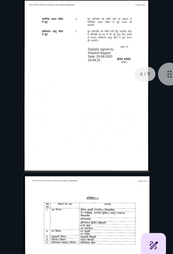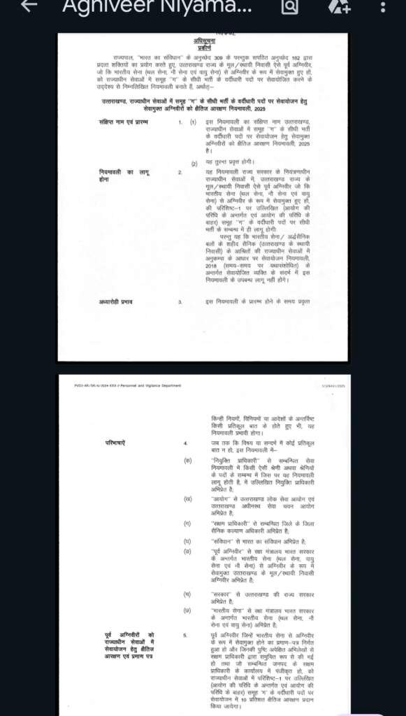 देहरादून। Big News Uttarakhand: मुख्यमंत्री पुष्कर सिंह धामी ने अपने एक और वायदे को पूरा करते हुए, सेवामुक्त होने वाले अग्निवीरों को विभिन्न विभागों की वर्दीधारी सेवाओं में दस प्रतिशत क्षैतिज आरक्षण प्रदान कर दिया है। इस संबंध में सोमवार को कार्मिक एवं सर्तकता विभाग की ओर से विधिवित तौर पर उत्तराखंड राज्याधीन सेवाओं में समूह ग के सीधी भर्ती के वर्दीधारी पदों पर सेवायोजन हेतु सेवामुक्त अग्निवीरों को क्षैतिज आरक्षण नियमावली – 2025 जारी कर दी है।