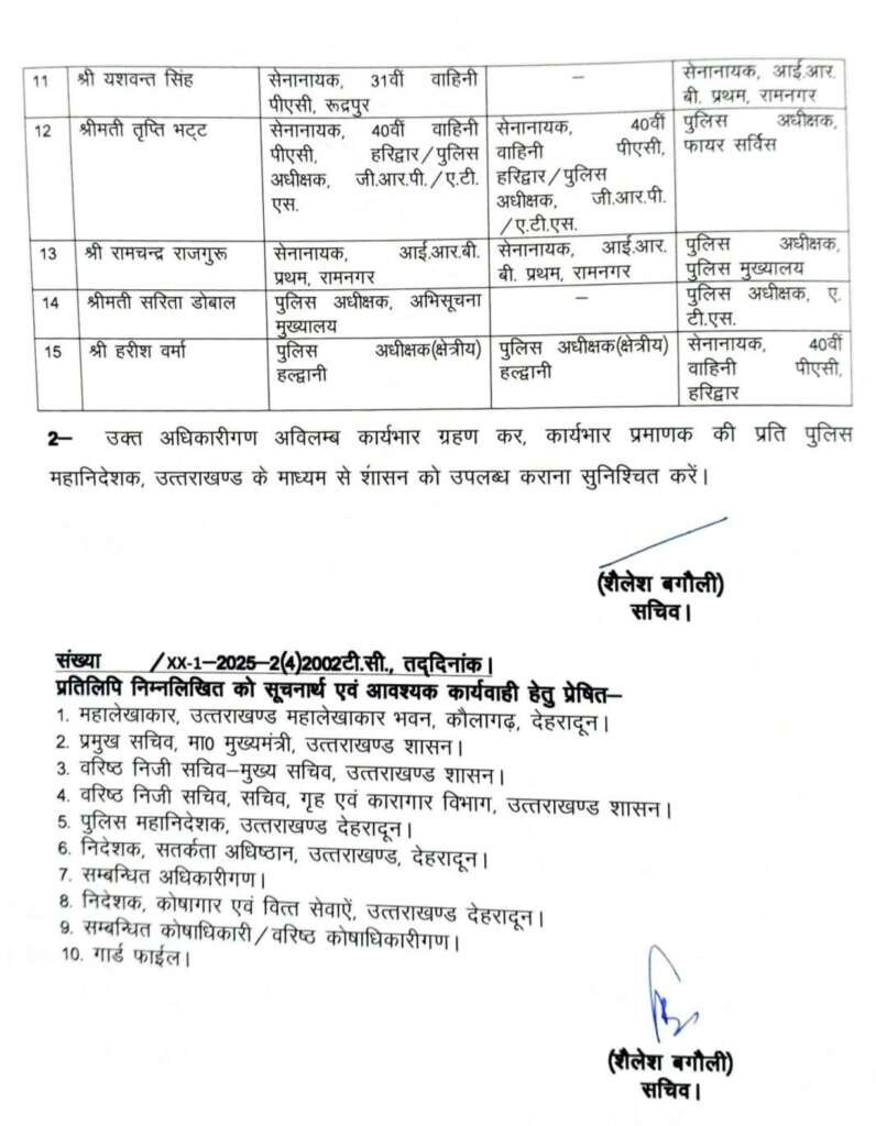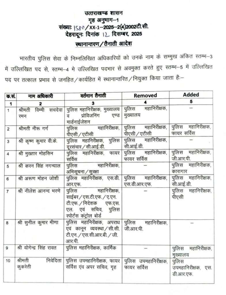 — शासन में अपर सचिव गृह की जिम्मेदारी देख रही निवेदिता कुकरेती को अब पुलिस उपमहानिरीक्षक एसडीआरएफ बनाया गया है।