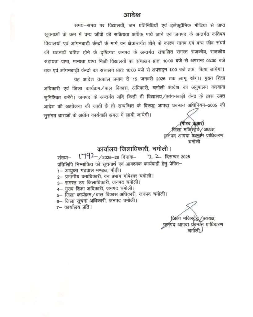 Chamoli News- उत्तराखंड के चमोली जिले में वन्यजीवों की एक्टिविटी बढ़ने के चलते स्कूल और आंगनबाड़ी केंद्रों के समय में परिवर्तन किया गया है जिले में वन्यजीवों के हमलों का खतरा बढ़ रहा है, जिसे देखते हुए जिला प्रशासन ने स्कूलों और आंगनबाड़ी केंद्रों के खुलने और बंद होने के समय में बदलाव किया है। आदेश के अनुसार अब सभी सरकारी और निजी स्कूल सुबह दस बजे खुलेंगे और तीन बजे बंद होंगे। वहीं, आगंनबाड़ी केंद्र दस से एक बजे तक ही संचालित होंगे।
