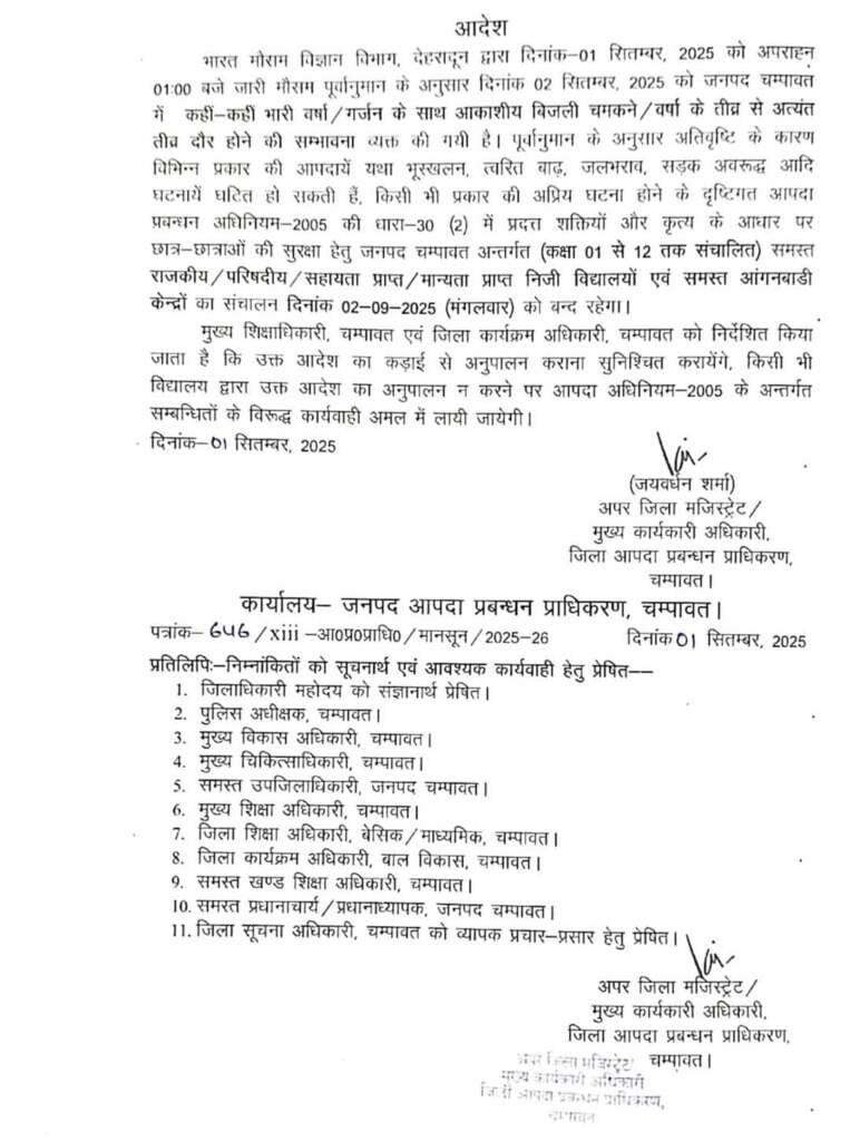 मौसम विज्ञान केंद्र, देहरादून के अनुसार जनपद चंपावत में भी भारी से बहुत भारी वर्षा का पूर्वानुमान है। इसके मद्देनजर चंपावत जनपद में 2 सितम्बर अर्थात मंगलवार को सभी आंगनबाड़ी केंद्रों के साथ कक्षा 1 से 12वीं तक के विद्यालयों में अवकाश घोषित किया गया है।
