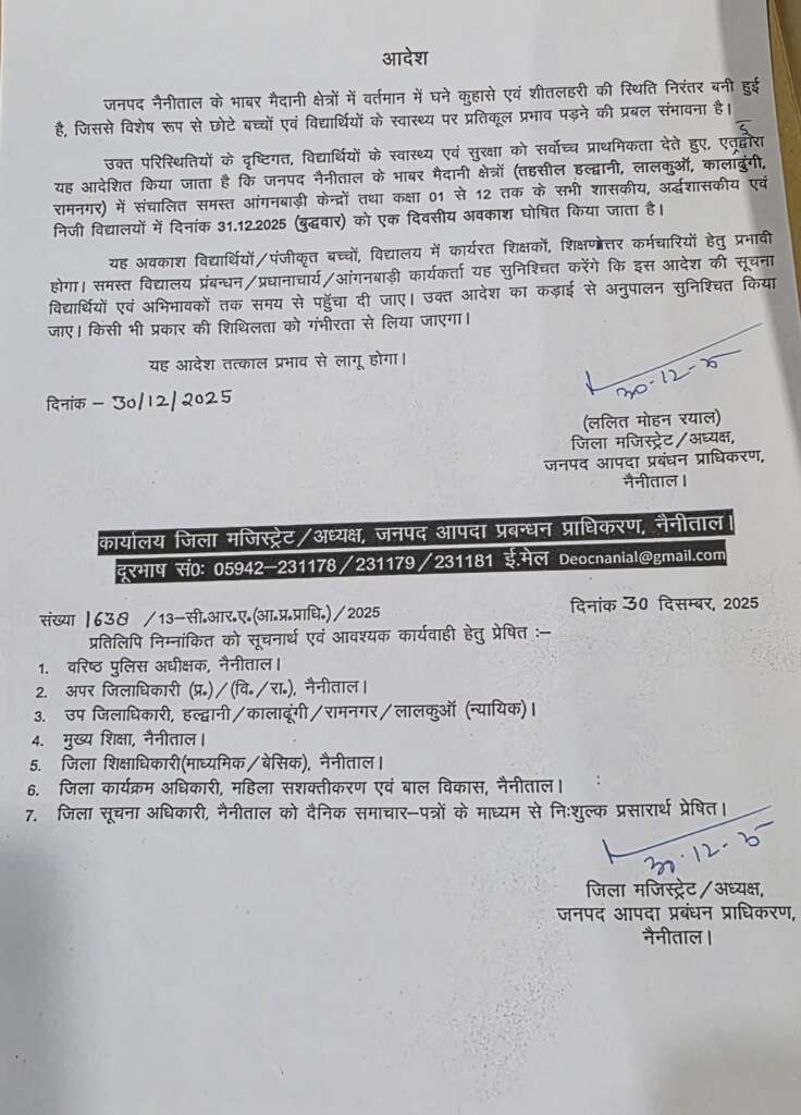 उक्त परिस्थितियों के दृष्टिगत, विद्यार्थियों के स्वास्थ्य एवं सुरक्षा को सर्वोच्च प्राथमिकता देते हुए, एतद्वोरा यह आदेशित किया जाता है कि जनपद नैनीताल के भाबर मैदानी क्षेत्रों (तहसील हल्द्वानी, लालकुआँ, कालाढुंगी, रामनगर) में संचालित समस्त आंगनबाड़ी केन्द्रों तथा कक्षा 01 से 12 तक के सभी शासकीय, अर्द्धशासकीय एवं निजी विद्यालयों में दिनांक 31.12.2025 (बुधवार) को एक दिवसीय अवकाश घोषित किया जाता है।