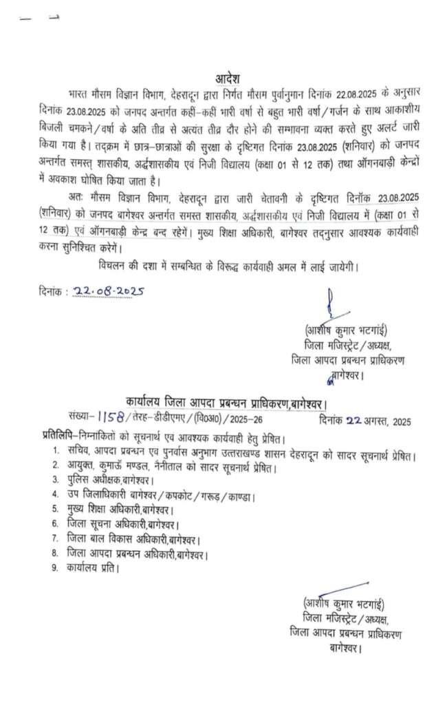 बागेश्वर। जनपद में गतिमान वर्षा के मध्येनजर किसी भी संभावित आपदा की गंभीरता को देखते हुए जिलाधिकारी महोदय के निर्देशों के क्रम में जनपद बागेश्वर के समस्त शासकीय, अशासकीय एवं निजी विद्यालय (कक्षा 1 से 12 तक) एवं आंगनबाड़ी केंद्रों में दिनांक 23 अगस्त 2025 (शनिवार) को अवकाश रहेगा।