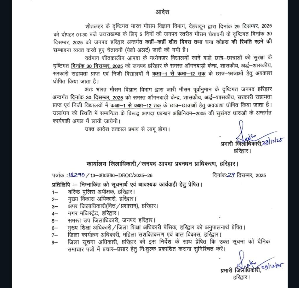 Haridwar News- शीतलहर और घने कोहरे की आशंका को देखते हुए जिला प्रशासन ने महत्वपूर्ण निर्णय लिया है। भारत मौसम विज्ञान विभाग, देहरादून द्वारा जारी पांच दिवसीय मौसम चेतावनी के तहत जनपद हरिद्वार में 30 दिसंबर 2025 को शीत दिवस और घने कोहरे की संभावना जताई गई है। इसे देखते हुए विद्यार्थियों की सुरक्षा के मद्देनज़र जनपद के सभी आंगनबाड़ी केंद्रों एवं कक्षा 1 से 12 तक के समस्त शासकीय, अर्द्ध-शासकीय, सरकारी सहायता प्राप्त एवं निजी विद्यालयों में मंगलवार को अवकाश घोषित किया गया है।