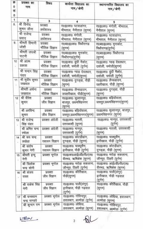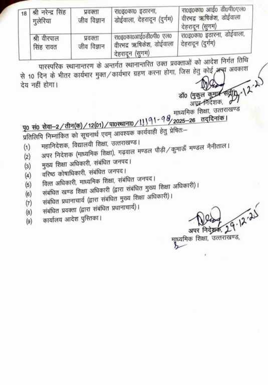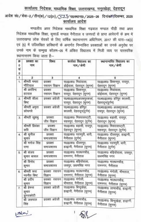 शासन द्वारा जारी आदेश के मुताबिक मण्डलीय अपर निदेशक माध्यमिक शिक्षा गढ़वाल मण्डल पौड़ी तथा अपर निदेशक माध्यमिक शिक्षा, कुमाऊँ मण्डल नैनीताल व जनपदों से प्राप्त आवेदनों के क्रम में उत्तराखण्ड लोक सेवकों के लिए वार्षिक स्थानान्तरण अधिनियम, 2017 की धारा-18 (3) एवं (5) में उल्लिखित प्राविधानों के अन्तर्गत निम्नांकित प्रवक्ताओं का उनके अनुरोध पर उनके नाम के सम्मुख कॉलम-05 में अंकित विद्यालय में निजी व्यय पर पारस्परिक स्थानान्तरण किया जाता है।